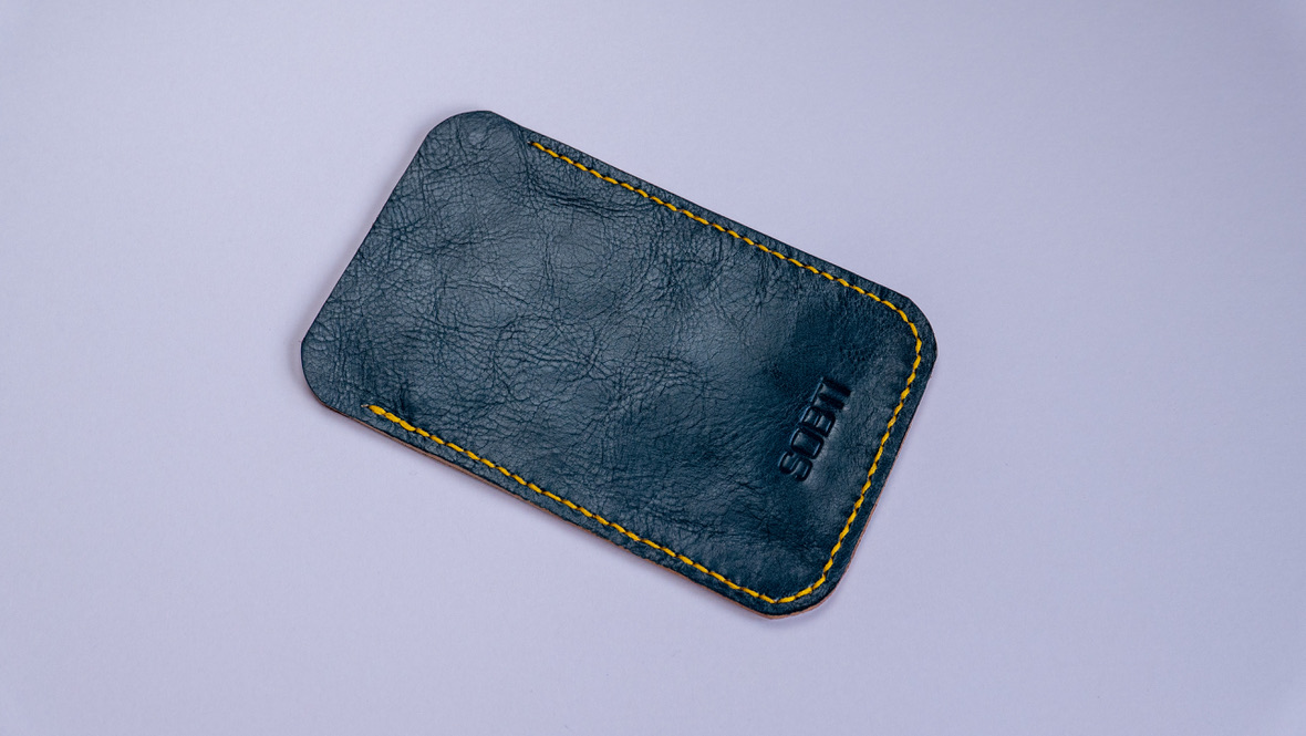 Smart Phone Sleeve: Blue Leather with Yellow thread